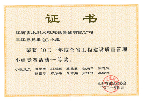 公司獲得2021年度江西省工程建設質量管理小組競賽活動一等獎