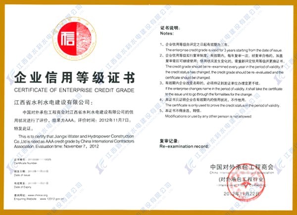 根據商務部、國資委聯合發布的《商會協會行業信用建設工作指導意見》的要求,中國對外承包工程商會于2012年9月啟動2012年度對外承包工程與勞務合作企業信用等級評價工作。經對外承包工程與勞務合作企業信用等級評審委員會第八次工作會議審議,江西省水利水電建設有限公司被評定為2012年度對外承包工程企業信用評價AAA級信用企業。