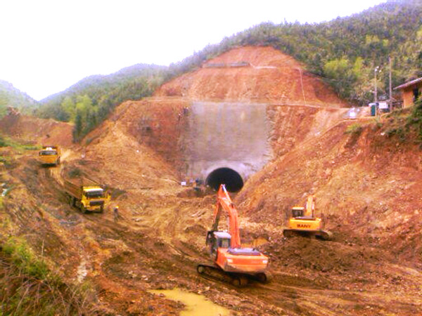 高倚四級水電站位于遂川江北支江高倚段,壩址座落在江西省遂川縣大坑鄉(xiāng),是贛江水系一級支流遂川江北支流梯級開發(fā)電站群中的一座。該水電站是一座以水力發(fā)電為主的低壩引水式小型水電站工程,安裝3臺軸流定槳立式水輪發(fā)電機組,總裝機容量7500千瓦,多年平均發(fā)電量2466萬千瓦時。水庫正常蓄水位134.5米,總庫容224.3萬立方米,主要由擋水壩建筑物、引水建筑物、廠房建筑物、防護工程及并網輸電線路五部分組成,為小(Ⅰ)型水電站工程,工程等別為Ⅳ等。大壩壩軸線總長269米,引水隧洞總長1414.9米,隧洞為無壓城門形斷面,開挖斷面達60平方米(屬超大型斷面),引水隧洞進口支洞長度42米。