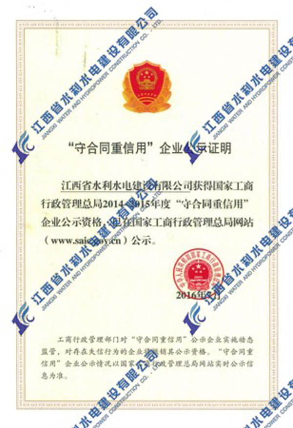 2016年我公司首次榮獲國家工商行政管理總局2014-2015年度“守合同重信用”企業公示資格。“守合同重信用”公示活動,是工商部門依托合同行政監管職能組織開展的旨在推進企業信用建設的“守重”企業公示活動,是長期以來我國社會信用體系建設的重要組成部分。