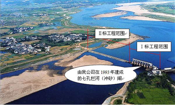 撫河焦石壩水庫的主要作用是抬高撫河水位,引水灌溉撫州、宜春、南昌三市七縣(市、區)37個鄉鎮共120萬畝農田,近年來又為南昌市及周邊城鎮提供工業、生活和環境用水約2×108 m3/年,社會、經濟效益十分明顯。撫河焦石壩水庫除險加固工程分兩期實施,一期攔河閘壩加固工程劃分為一個標段,二期工程劃分為三個標段,我公司中標承建了一期工程(即Ⅰ段段)和二期工程中的Ⅱ標段。