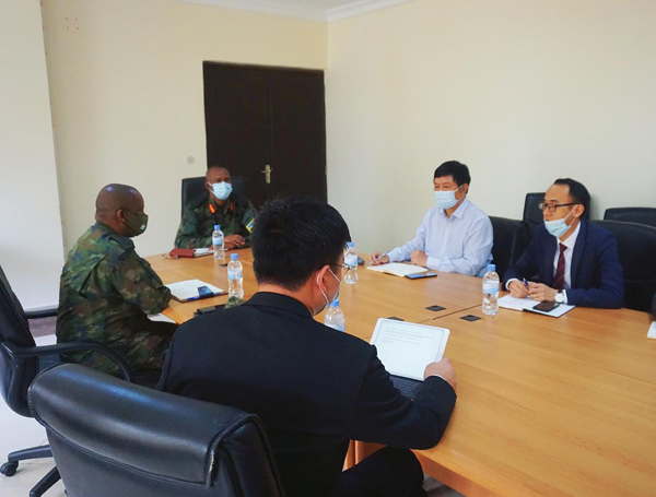 張周平一行會見了軍事學院項目業主--盧旺達軍事學院司令。雙方就疫情期間項目的施工情況進行了充分的交流,氣氛熱烈融洽。雙方非常珍惜和重視此次合作,表示會全力支持推動項目進展,并期待兩個團隊在日后工作中能夠繼續保持積極有效的溝通,務實地解決施工難點,盡早完成預期建筑施工目標。