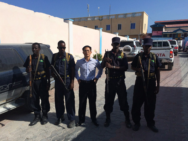 我們入住的是半島皇宮酒店,也是中國駐索使館的臨時辦公產所。三道門的安全防護可謂警備森嚴,戰爭國家的氣象從這可見一斑。酒店內布置簡單,但設施齊全,與酒店外充滿殺氣的氣氛不同,酒店內人來人往,商人喝著咖啡悠閑地談著生意。我們也坐著邊喝咖啡邊商談工作計劃,不時有索馬里人來打招呼,用中文說“你好”,并客氣地握手表示熱情歡迎來到摩加迪沙。
