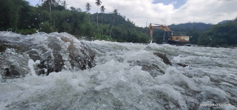 文字說明;該照片是在伯恩河中用手機拍攝,是印尼疫情復工后開辟新施工道路時的場景。在奔騰的洪流中激流拍石,浪花飛濺,挖機迎難而上,象征著公司堅韌不屈的品格、水建人大無畏的工作熱情。對岸的滿山綠樹在藍天白云下,勾勒出一幅壯麗的畫面,預示著伯恩電站的美好未來,高高的椰子樹,象征著集團公司輝煌的明天!